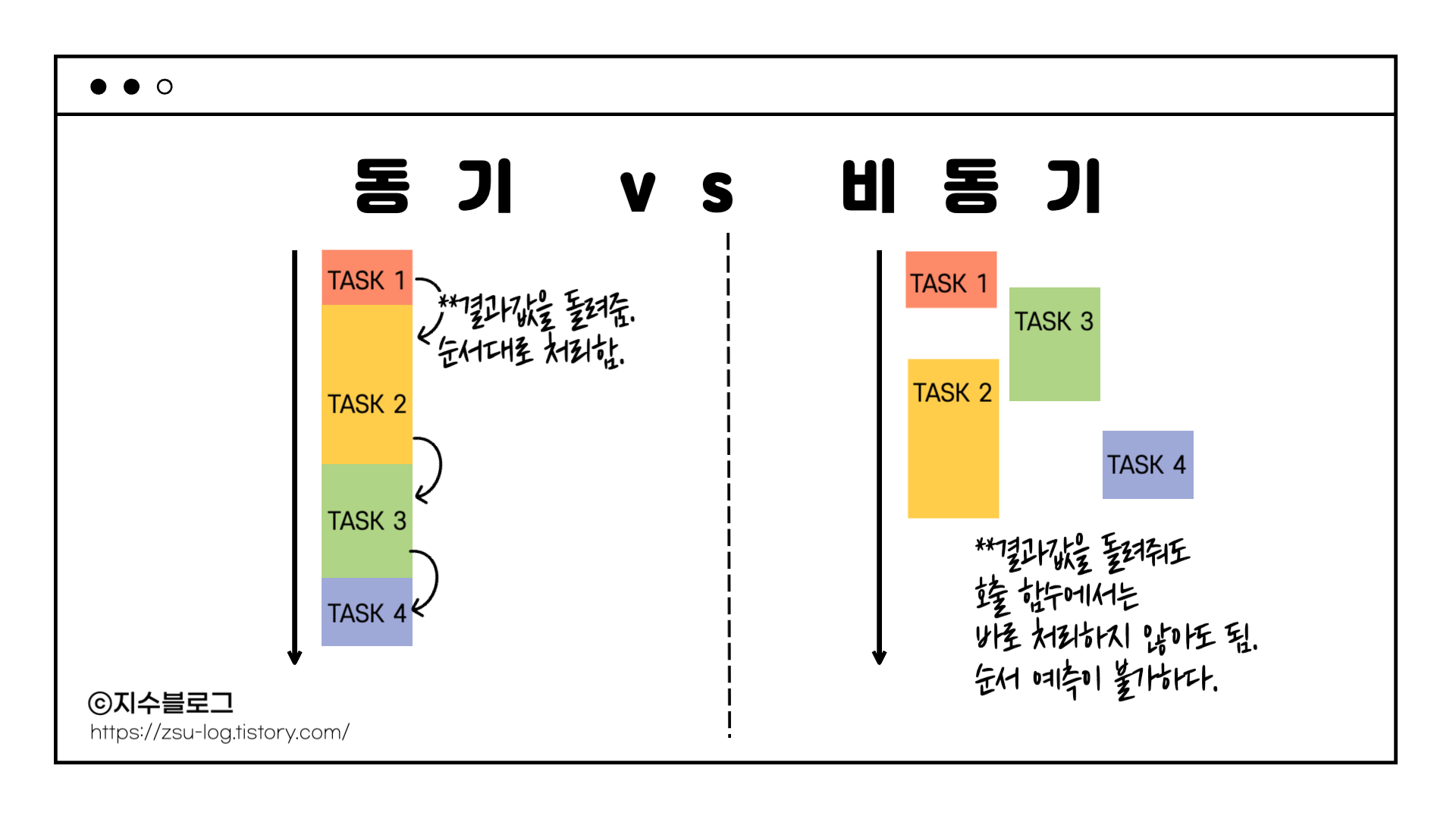 다른 작업의 완료를 대기하지 않아도 되며, 결과의 순서를 예측하기 어렵다.