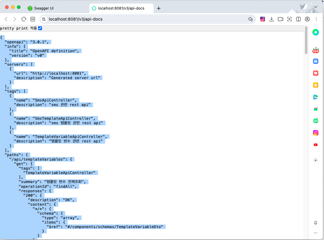 - OpenAPI definition 아래에 있는 `/v3/api-docs` 링크를 클릭합니다