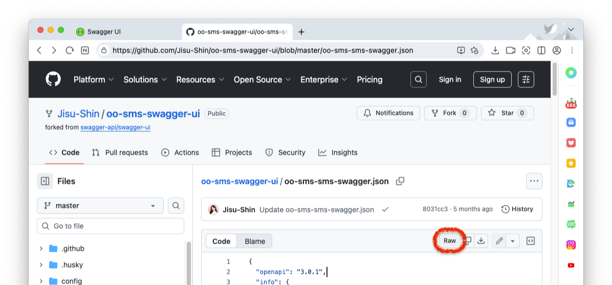 - GitHub로 push한 swagger.json 파일 클릭합니다 (보이는 이미지에서는 `oo-sms-sms-swagger.json` )