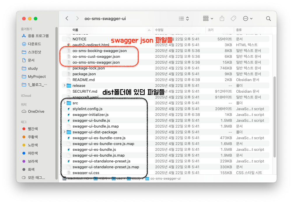 - git clone 하여 로컬에서 확인할 수 있는 swagger-ui 폴더입니다. dist 폴더 내부의 모든 파일을 루트 경로로 이동합니다 (검정색으로 표시된 부분들)