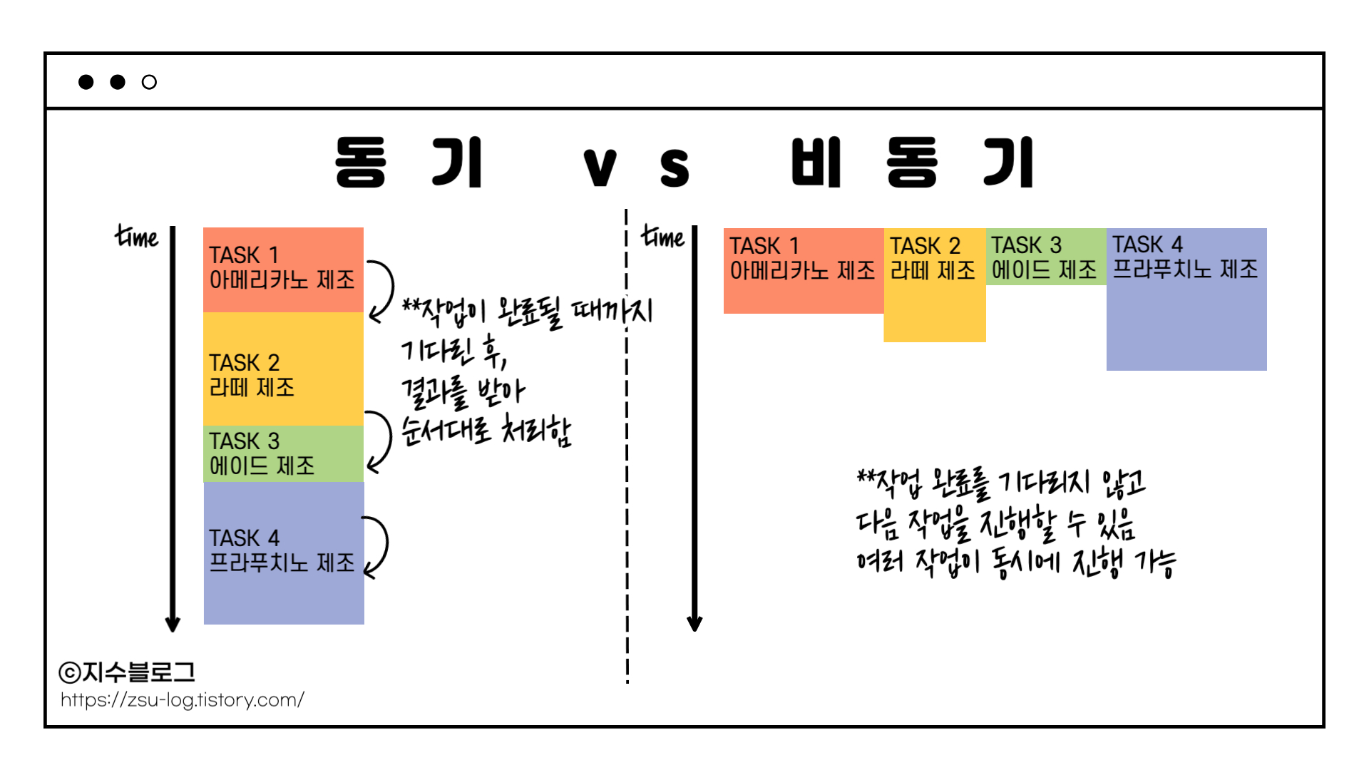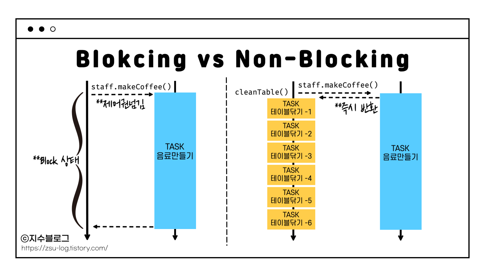 음료 제조와 테이블 닦기가 동시에 진행되므로 총 소요 시간은 3초이며, 같은 시간 동안 블로킹 방식보다 훨씬 많은 작업을 완료할 수 있습니다.