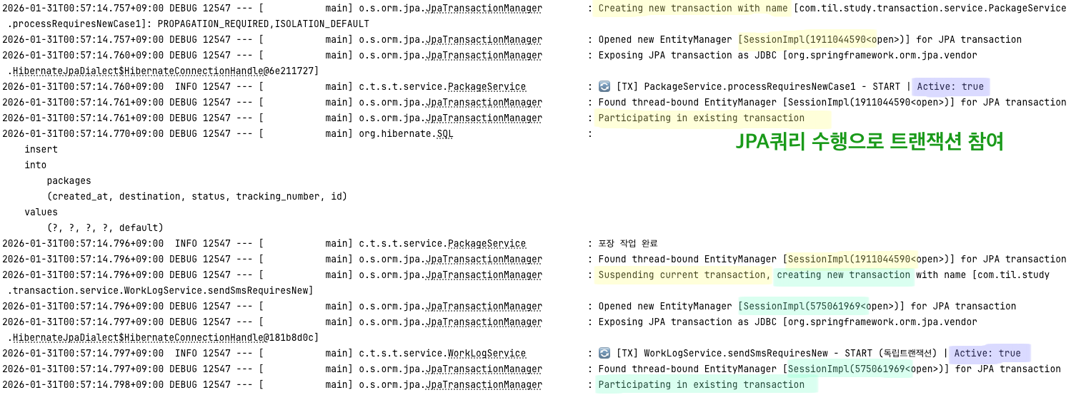 `logging.level.org.springframework.orm.jpa.JpaTransactionManager=DEBUG` 설정을 통해 현재 트랜잭션이 어떻게 적용되는지 명확하게 확인할 수 있었습니다. 특히 로그에 표시되는 세션 번호가 매우 유용했는데, 세션 번호를 통해 서로 다른 물리 트랜잭션인지 같은 트랜잭션인지 직관적으로 파악할 수 있었습니다.