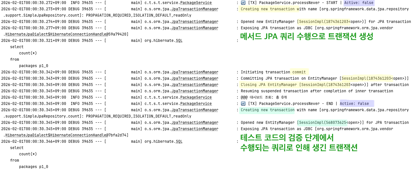 메서드가 종료된 이후에 보여지는 트랜잭션 생성 로그는 테스트 코드의 검증단계에서 수행되는 쿼리로 인해 생긴 트랜잭션입니다.
