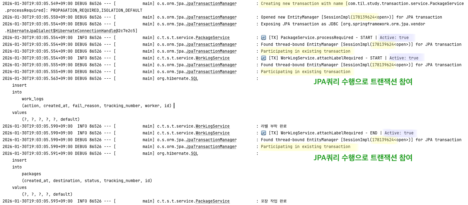 이 설정을 통해 트랜잭션의 시작, 커밋, 롤백, 참여 등의 동작을 콘솔에서 확인할 수 있습니다.